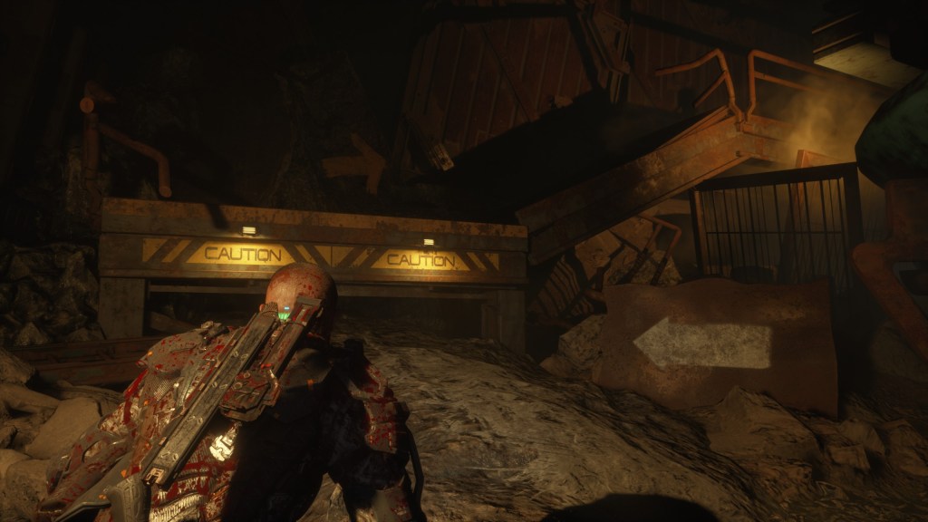 Speaking of the absence of puzzles, I believe this is a good point to get into what is, in my opinion, the worst part of The Callisto Protocol. The linear gameplay. It’s so linear that the game even tries to show you where to go with shiny yellow arrows. Yes, that yellow paint that we know from every new AAA game these days. It also exists in The Callisto Protocol. In a comedic amount. But what’s funny and ironic is, the game is already so linear, the player doesn’t even need these indicators to find out where to go. There is literally only one way you can go. It’s impossible to get lost in its chapters. Sometimes you find these side paths you can take to discover secrets or gather some items but they either somehow put you back on the correct path or they take you to a dead-end, forcing you to go back to the correct path. There is literally no other way. The arrows, the yellow paint, and the writings on the walls telling you what to do with the enemies, these all just comedically merge and tell you how stupid you are. The game doesn’t believe in your ability to follow a singular, straight path. It tells you, you, player, you are stupid. Absolutely abysmal stuff. This was also a nitpick that I had in God of War Ragnarök, with NPCs telling us what to do on every step and I hate to see it in this game too. And whenever you try to complain about issues like these, fans will try to tell you “oh maybe you just don’t like video games” or maybe we just don’t like how they’re made these days, how about that?
