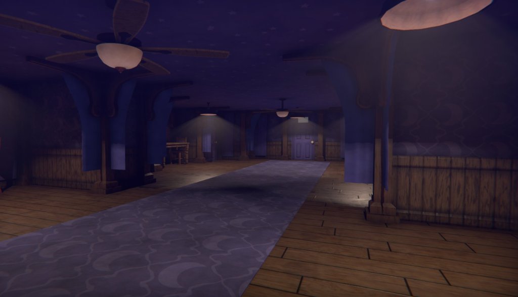 “been working on a non-euclidian puzzle-horror game based inside a dream world. navigate through the a liminal hotel using impossible doors and twisting geometry, Eyes and ballpit turrets.”