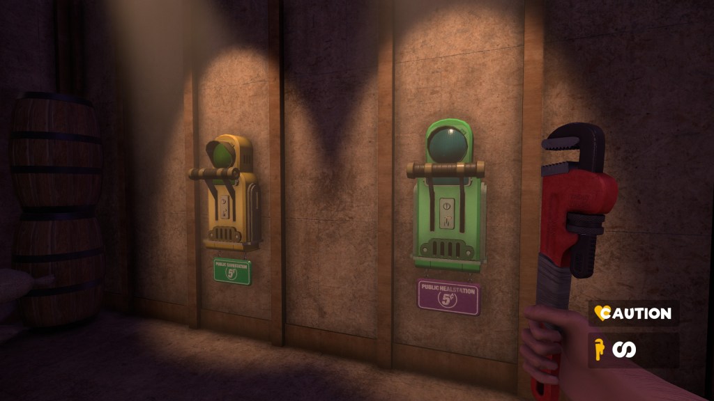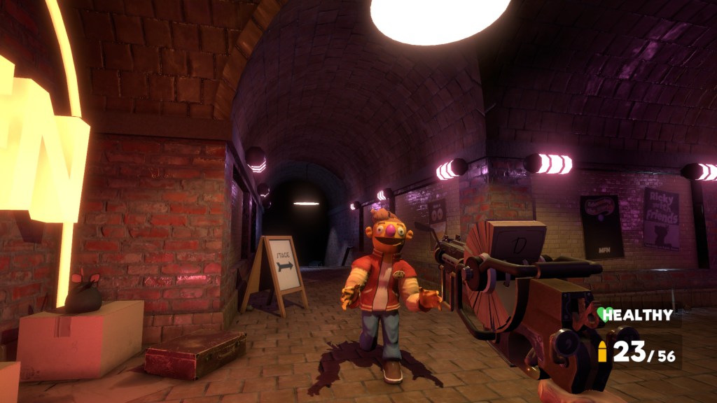 You can take down the puppets by hitting them with your trusty wrench or shoot them with unique guns. I say unique but that’s only in looks really. The guns are pretty standard for a first-person shooter game. Pistol type, shotgun type, hand grenade, etc. They are just designed in such a clever way that they don’t feel out of place at all.